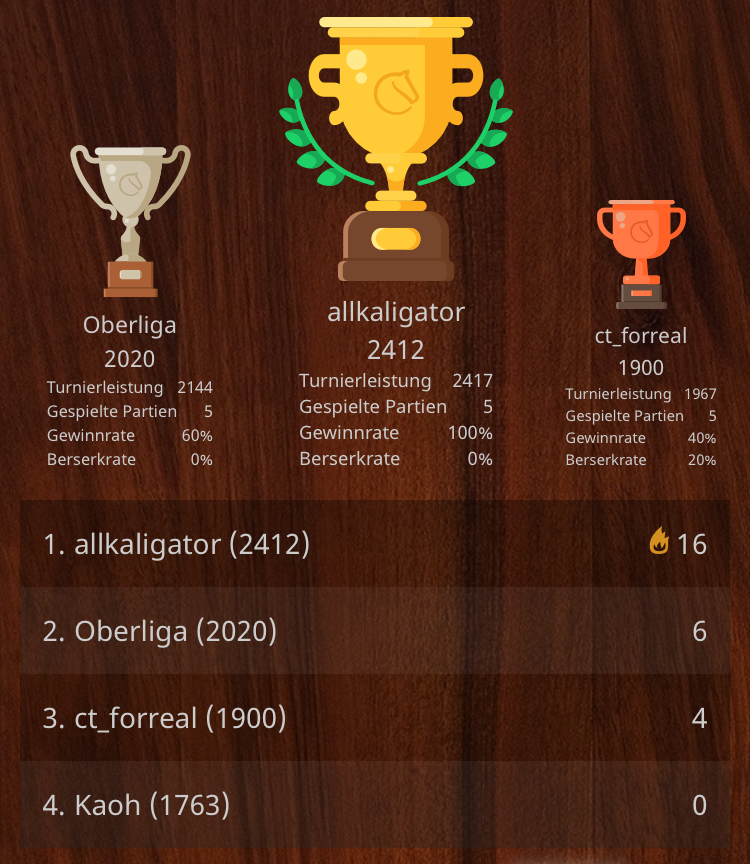 Für ihn gab es heute nichts zu holen, da der allseits berüchtigte „Schach-Alligator“ (der die erste und zweite Auflage des Turniers gewinnen konnte) nach dreimonatiger Abstinenz ein Comeback hingelegt hat – und wie. Nicht nur, dass er beide Duelle gegen seinen direkten Verfolger Oberliga gewinnen konnte, sondern auch seine Gesamtpunktzahl machte diesen Sieg klar wie Kloßbrühe.
